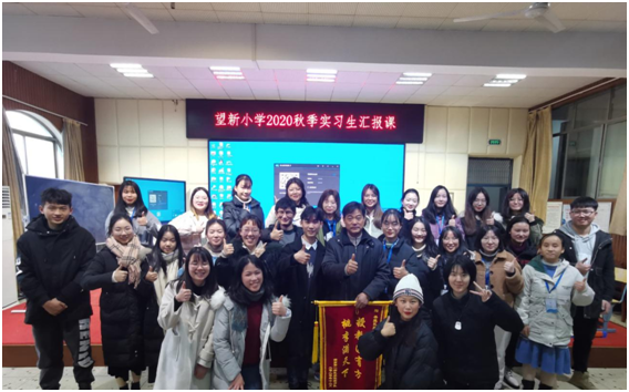 活动尾声,为表示对实习学校领导老师的感谢和敬意,实习队全体队员将“授教固有方 桃李满天下”的锦旗敬献给长沙岳麓区望新小学,并与刘校长进行合影留恋。