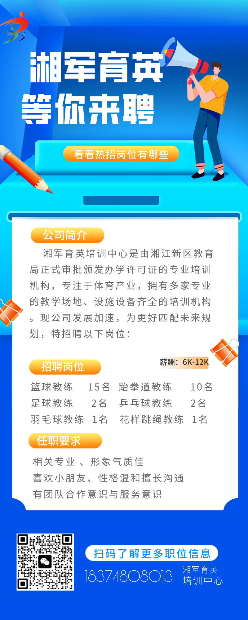 宣讲会上湘军育英培训中心主要负责人详细介绍了湘军育英培训中心的发展历程、企业文化、业务矩阵、发展规模和未来发展规划,帮助毕业生更好地了解湘军育英培训中心,逐一介绍各个部门的招聘要求和职位描述,供学员了解以便选择适合的岗位。湘军育英培训中心是由湘江新区教育局审批颁发办学许可证的专业的培训机构,专注于体育的产业。本次招聘会议让同学们对未来发展方向有了一定的认识,让毕业生对人才市场有更多的了解,以及未来的职业发展道路,明确职业发展方向,感受招聘会现场的气氛。本次专场招聘会共提供就业职位31个,实习岗位若干。
