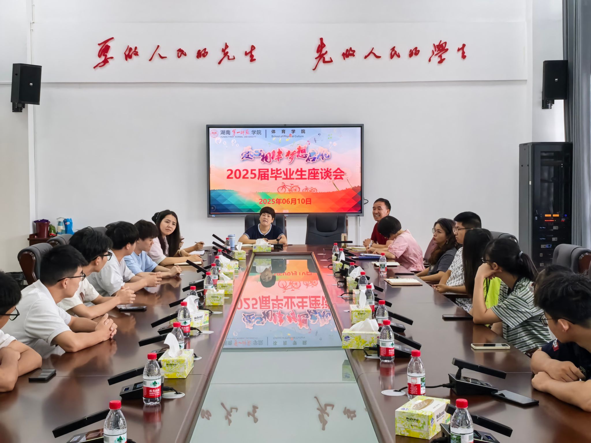 6月10日上午十点体院2025届毕业生座谈会在体育馆211会议室顺利召开,学院党政领导非常重视,党委书记邹华秀,副书记朱建伟,副院长郭宇,学工办主任叶晶,院团委书记唐智鹏,专业教研室主任单思文,全体辅导员及各毕业班学生代表22人参与会议。会上同学们就自己在学校的学习、工作、生活等各方面畅所欲言,对学校、学院提出了多项宝贵的意见和建议。座谈会最后,邹华秀书记做了“传承、坚守、展望”主题发言,祝福大家完成了大学本科教育,即将开启新的人生。愿每个人都能活成一束光,绽放着所有美好!