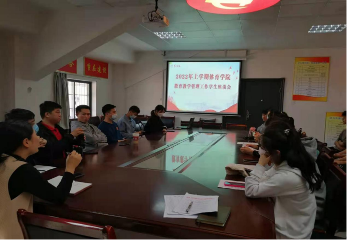 4月19日下午,亚洲无码人妻在看台下会议室召开了教育教学管理工作学生座谈会。亚洲无码人妻院长助理兼校督导丁小芬,体育教育系系主任谭飞、王正龙,教科办孔柏梅,教师代表李成权、崔建彪、陈志鹏,以及我院15名学生代表参加了此次座谈会。