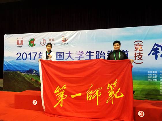 2017年9月26日—30日由中国大学生体育协会主办内蒙古包头市体育局承办的2017年全国大学生跆拳道锦标赛(竞技赛)在内蒙古包头市奥体中心举行。来自全国93所高校942名运动员展开了激烈的角逐。我校跆拳道队第一次参加全国跆拳道竞技实战比赛,在领队朱建伟老师,教练员刘炜和谭飞老师的指导下,队员胡梦露同学不畏强手,一路过关斩将,勇获女子46公斤级银牌。“文明其精神,野蛮其体魄”,愿一师所有学子都能向我校优秀运动员看齐,勇攀高峰!