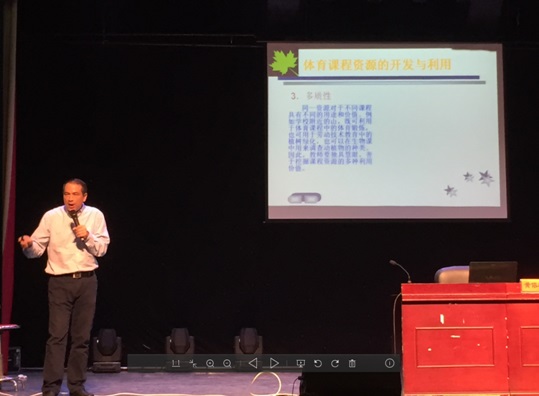 黄教授结合多年的实践经验与研究成果,理论联系实际,分别对体育课程资源的特点、分类、竞技运动项目的利用与开发、民族民间体育活动的利用与开发、新兴运动项目的利用与开发、体育设施资源的开发与利用、自然地理课程资源的开发、人力资源的开发与利用、体育信息资源的开发九个方面进行了详尽阐述,每讲一处知识点,便结合实际案例进行分析,并且运用了大量生动的视频材料,讲座内容新颖、语言幽默,现场气氛活跃,启发了大家对体育课程资源开发的认知与思考,为大家今后的学习提供了路径参考。