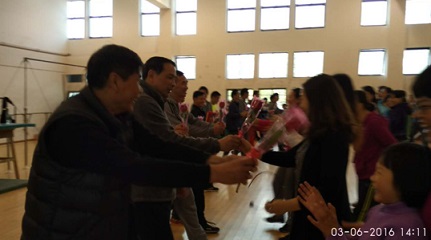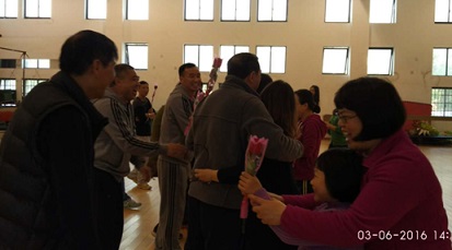 首先,学院教职工按男女性别以年龄大小为序排成两列纵队,相向而立。活动开始,所有男教师每人手持一朵鲜艳欲滴的红玫瑰,深情款款、笑脸盈盈地走向所对应的女老师那里,然后将手中的玫瑰赠与女老师,并给予一个暖暖的拥抱。随后,每位男教师大声的说出对女老师的“三八”节祝福。