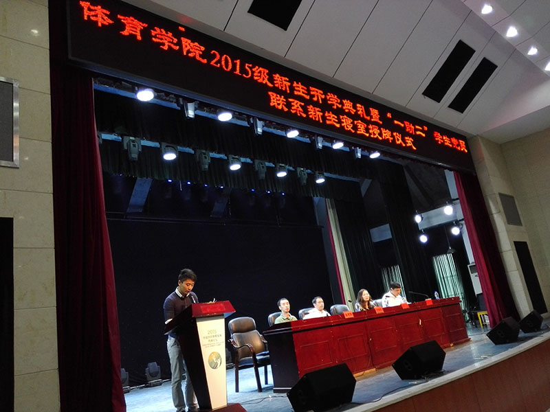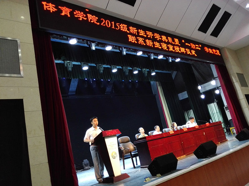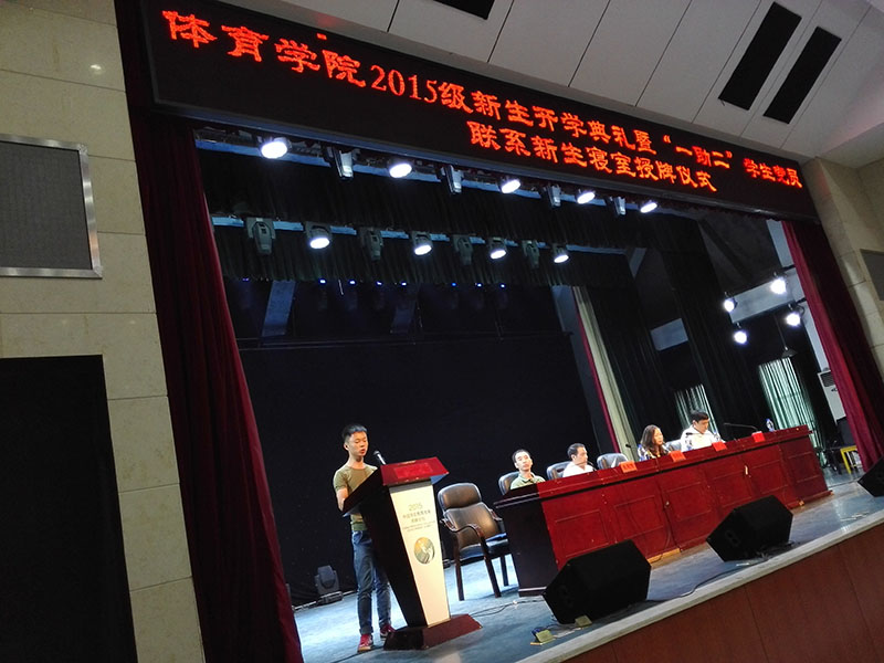 雄魂的国歌声中开学典礼的序幕徐徐拉开。首先,黄依柱院长发表讲话,向全体2015级新生、2013级六年制本科初招学生表示热烈的欢迎。院长详细介绍了我校的悠久历史、我院基本情况以及体育教育专业相关成果,分析了当下体育业的发展趋势和就业前景,号召全体新生扎实学好专业本领。