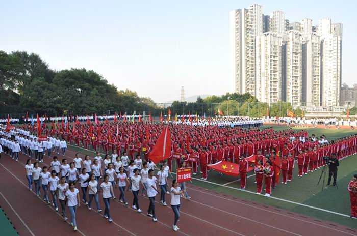 开幕式上,国旗校旗方阵、鲜花方阵、裁判员方阵和60个班级方阵迈着整齐的步伐一一入场,他们口号嘹亮,朝气蓬勃,生动地展示了城南学子饱满的精神、昂扬的斗志、无穷的想象力和创造力。在庄严的升国旗仪式后,副校长刘志敏致开幕词,704班田明鸿同学、胡琨同学分别代表运动员、裁判员进行宣誓。校长肖湘愚宣布运动会开幕。随后,城南书院2013级学生表演了《第九套广播体操》和《小苹果集体舞》、2014级学生表演了《七彩阳光广播体操》。同学们以饱满的热情、整齐的阵容获得了在场师生们的一致好评。