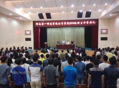 雄伟的国歌拉开了开学典礼的序幕。首先,黄依柱院长发表讲话,向全体2014级新生、2012级六年制本科初招表示热烈的欢迎。院长详细介绍了我校的悠久历史、我院基本情况以及体育教育专业相关成果,分析了当下体育业的发展趋势和就业前景,号召全体新生扎实学好专业本领。
