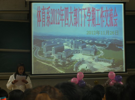 11月26日晚6点半在文B206教室召开“体育系2012年学生干部交流大会”,体育系党总支袁向荣书记、祝娅副书记、辅导员唐智鹏老师出席大会,大会由学工办主任纪鑫主持,体育系团总支、学生会、社团联合会、青年志愿者协会四大部门共98人到会。