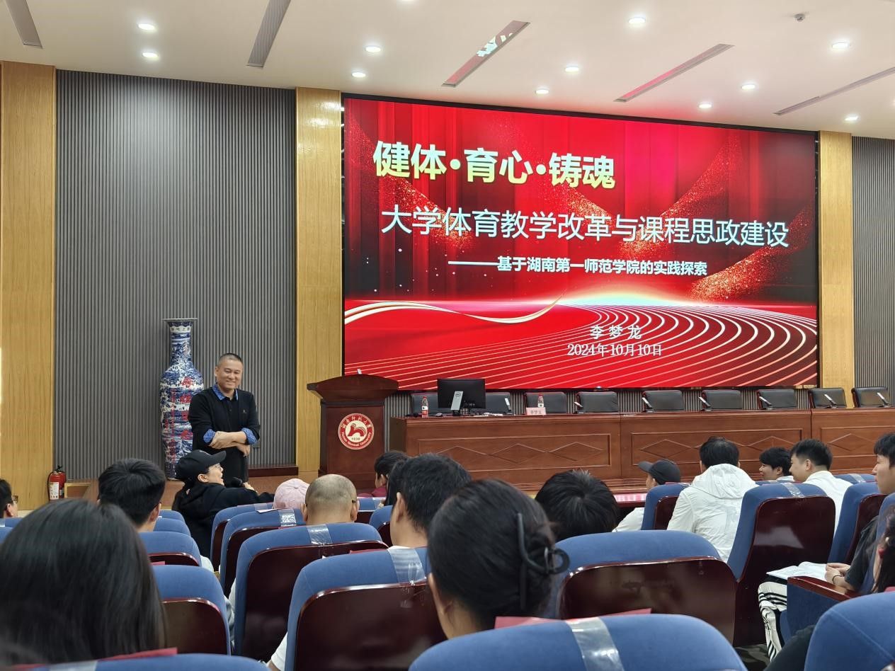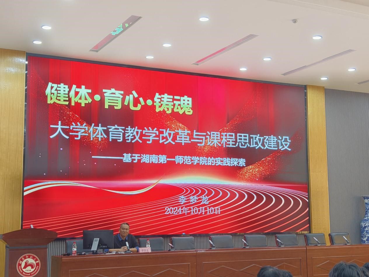 2024年10月10日,湖南省高校公共体育课程资源整合能力与教学质量提升高级研修班在湖南师范大学亚洲无码人妻举办,我院李梦龙院长受邀进行专题汇报,主题为“大学体育教学改革与课程思政建设——基于湖南第一师范学院的实践探索”。 李梦龙院长在汇报中强调了体育课程思政的重要性和必要性,并分享了湖南第一师范学院在体育教学改革与课程思政建设方面的宝贵经验。