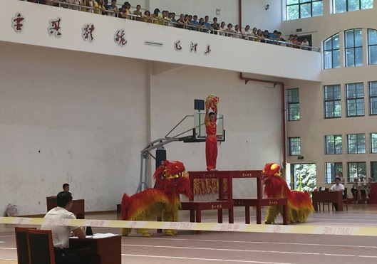 此次比赛赛期为4天(6月3日至6月7日),各大高校代表队在我校体育馆激烈开赛。这次比赛的裁判阵容十分强大,有国际级舞龙舞狮裁判6名、国家级武术裁判3名。其中我校刘炜老师是湖南省最年轻的国家级武术裁判,担任此次武术比赛的副总裁判长。