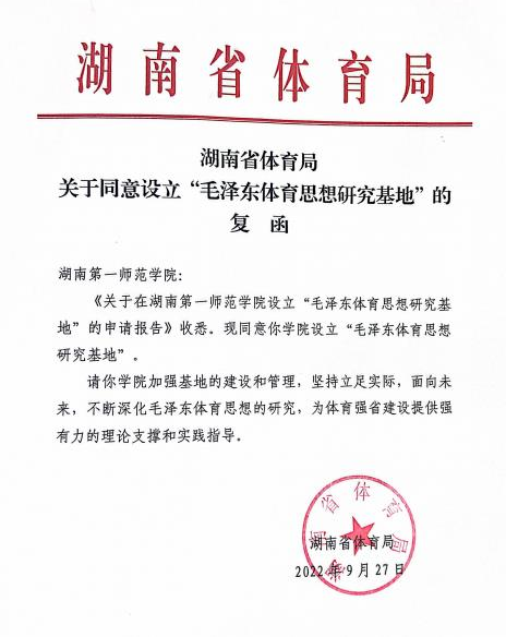 近日,我院申报的“毛泽东体育思想研究基地”成功获批湖南省体育局研究基地。“毛泽东体育思想研究基地”以毛泽东体育思想为主要研究领域,重点关注毛泽东体育思想的理论研究、课程研究以及社会实践研究三个方向,基地现有研究人员15人,教授5人、副教授7人、博士5人。此次基地获批,是学院党委行政和全体教职工长期共同努力的结果,我院将以此为契机,立足实际,面向未来,不断深化毛泽东体育思想的研究,进一步发挥基地在该领域的示范、引领和辐射作用,为体育强省建设提供强有力的理论支撑和实践指导。