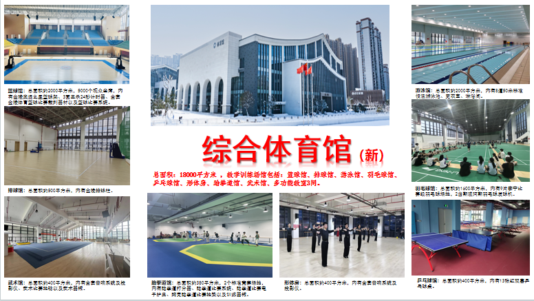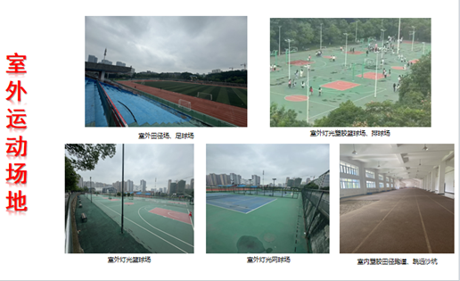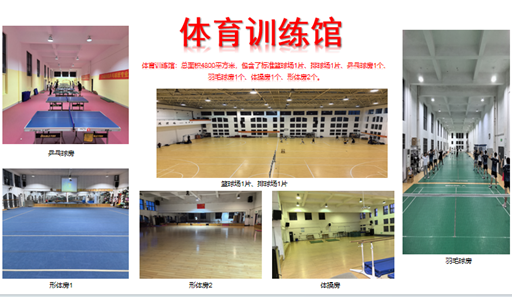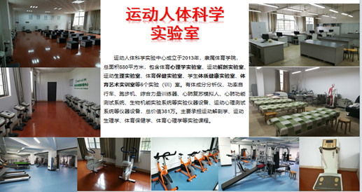 教学场地和设施是人才培养的基本保障,我校现拥有综合体育馆1个(包含了篮球馆、排球馆、游泳馆、羽毛球馆、乒乓球馆、形体房、武术馆、跆拳道馆、多功能教室及力量训练房等)、体育训练馆1个(包含了篮球场、排球场、乒乓球房、羽毛球房、形体房、体操房等)、室外运动场若干(包含120 m长室内标准塑胶田径跑道7条、室外400m标准塑胶田径场1个、室外篮球场12个(其中4个室外灯光塑胶篮球场)、室外灯光塑胶网球场4个、室外排球场 2个、室外健身路径1片)、人体科学实验室(包含了体育心理学实验室、运动解剖实验室、运动生理实验室、体育保健实验室、学生体质健康实验室、体育艺术实训室等6个实验(训)室。)
