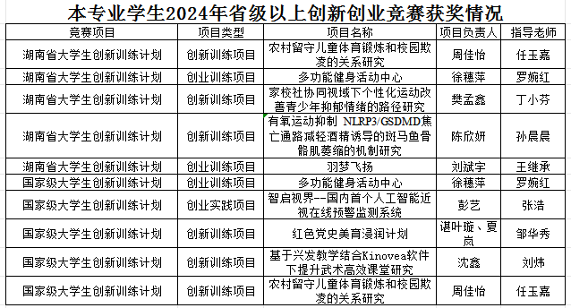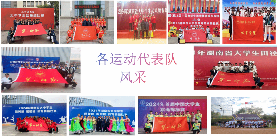 我院现拥有18支运动代表队,其中包括男篮、女篮、男足、女足、排球、乒乓球、羽毛球、健美操、啦啦操、武术、跆拳道、体育舞蹈、游泳、网球、田径、花样跳绳、舞龙舞狮、棒球。近五年来,我校学子先后在省级及国家级运动竞赛中斩获132金85银77铜,总奖项654,在湖南省同类院校中名列前茅。