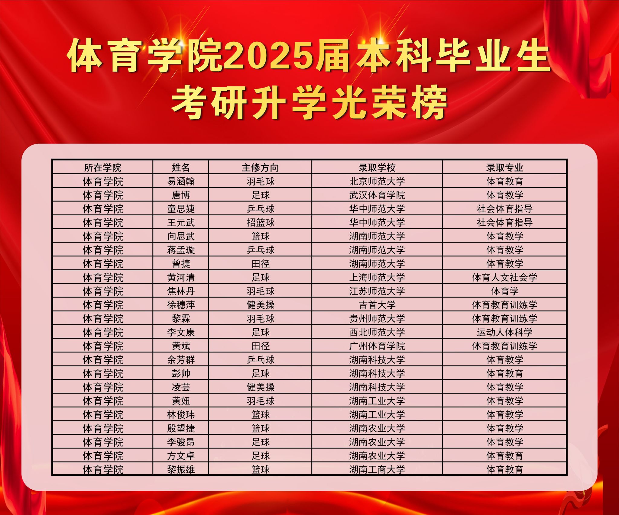 本专业学生毕业去向遍布湖南省各市州及国内沿海开放城市的中小学校及其他企事业单位,主要从事教学、教育管理及群众体育指导工作等,毕业生因其良好的人文素养、运动技能及教学实践能力,备受用人单位 欢迎。历年毕业生就业率95%以上,每年近20%的毕业生考取北京体育大学、上海体育大学、华东师范大学、华中师范大学、武汉亚洲无码人妻等知名高校硕士研究生,部分毕业生继续深造攻读博士学位。